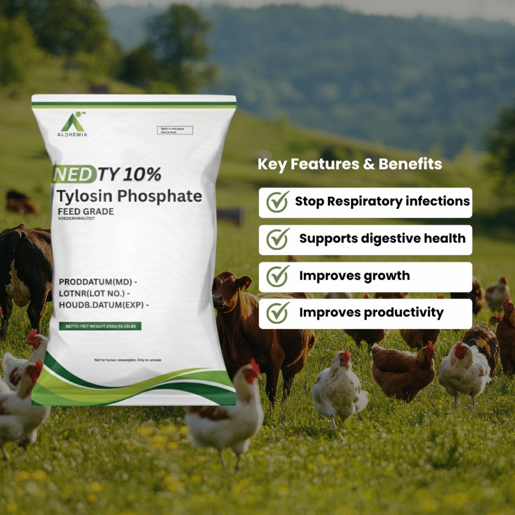 NED TY 10% is a feed-grade Tylosin Phosphate premix containing 10% active ingredient, designed for use in livestock and poultry nutrition programs. It supports optimal performance by maintaining feed hygiene and assisting in managing production challenges associated with intensive farming.